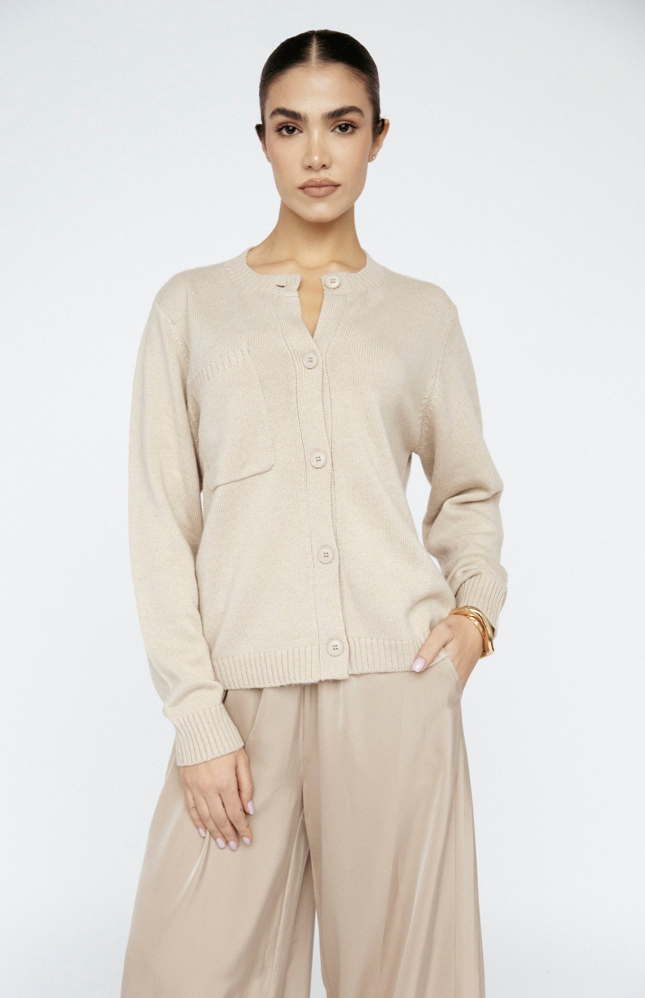 Crafted from our lightweight cashmere blend, this versatile sweater features a button-front detail and a chic bust pocket. Wear it open for effortless layering or closed for a polished look—the breathable, soft fabric offers all the luxe of cashmere with easier care and a lighter, year-round wear.
