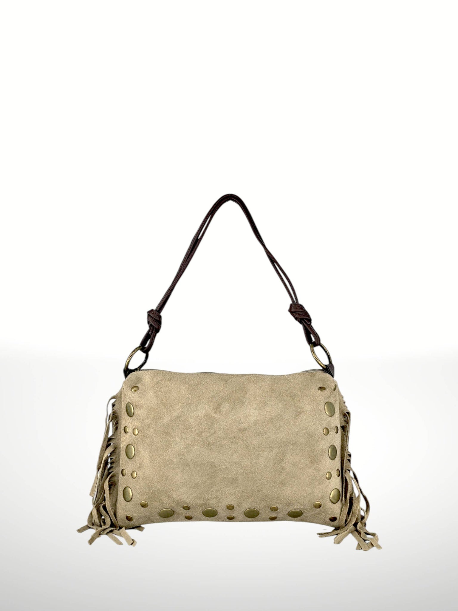 Bohemian-inspired bag with a contemporary style that blends the softness of suede with distinctive handcrafted details. Its rectangular, flexible, and lightweight design naturally adapts to the body, offering a comfortable and elegant look for both day and night. The decorative metal applications distributed on the sides and front, along with the side fringes, add dynamism and an artisanal character that highlights the identity of ITALIAN’S LEATHER. This bag, carefully crafted from genuine cowhide leather, embodies the brand's passion and expertise in Italian leather goods since 1980.