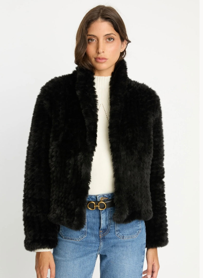 Introducing the Ivanna Jacket—a statement piece in soft black faux fur, perfect for the chilly season. This collarless, cropped style features a shawl-style neckline and a subtle textural finish that adds depth and sophistication. A hidden hook-and-eye closure keeps the silhouette clean and refined.