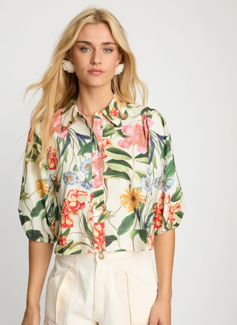 The Juliette Top in Buttercream Floral brings a touch of romantic charm to everyday dressing. Crafted from crisp cotton poplin, it offers a breathable feel with gentle structure that holds its shape beautifully throughout the day. The relaxed button-down silhouette features a collared neckline and billowed sleeves gathered at the cuffs for an effortless, feminine finish.