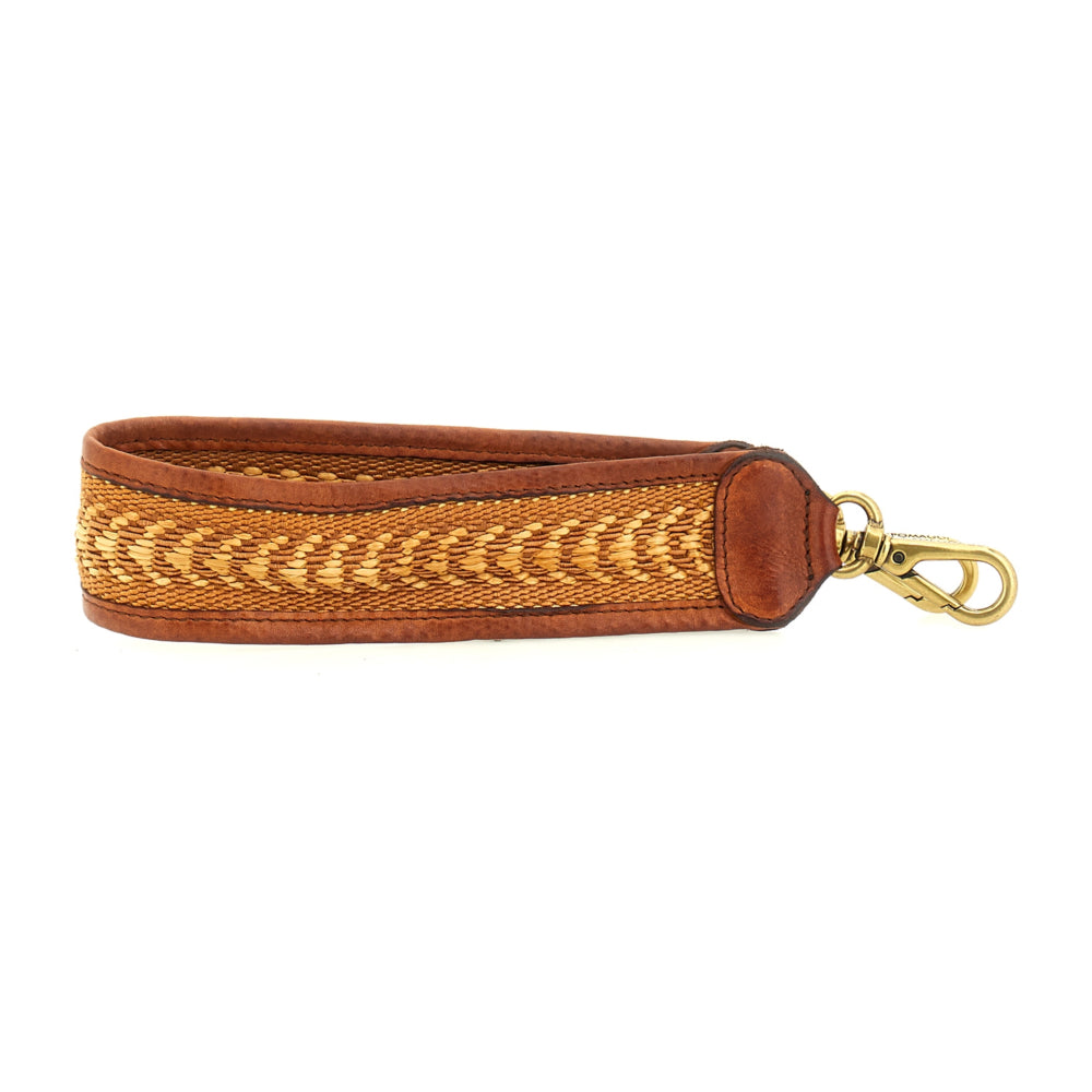 Decorated shoulder strap. The Arya line is reinterpreted through new shapes and details. Of immediate impact is the insertion of the ribbon and raffia cross body strap with a more summery flavour and the decorative detail with military coats of arms on the fastening flap available as a variant. Made from garment-dyed natural cowhide leather. Made in Italy.
