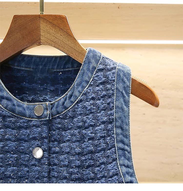 Unveil timeless style with this chic sleeveless knit dress, perfect for transitioning through spring to autumn. Crafted with care, the round neckline offers classic elegance while the full-length buttoned front adds a touch of modern sophistication. Denim stitching contours the dress, providing durability and an edgy twist to the soft knit fabric. Dual flap pockets on the chest blend functionality with fashion. Whether paired with sandals or boots, this versatile piece is sure to become a staple in any wardrobe. Embrace the changing seasons with this stylish and comfortable dress that effortlessly combines casual charm with a hint of sophistication.