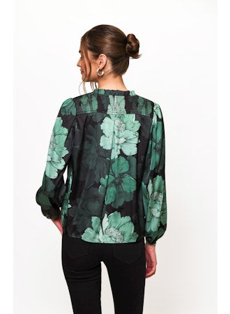 Long sleeve smocked blouse in Forest Tonal Sketched Floral