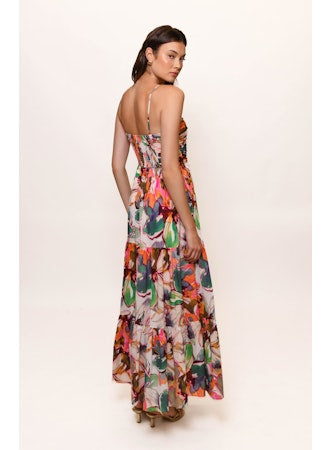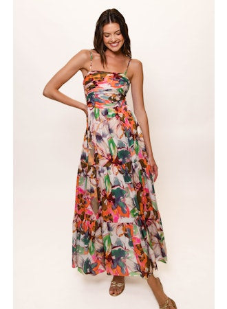 Ruched bodice tiered maxi dress in Blush Messy Rainbow Watercolor Floral
