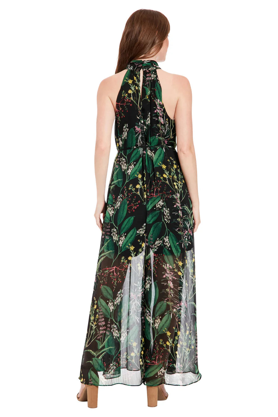 Dazzle in the Godiva jumpsuit featuring a halter mock-neck, sleeveless design, and waist tie detail. The alluring floral print makes it the perfect choice for any special occasion.