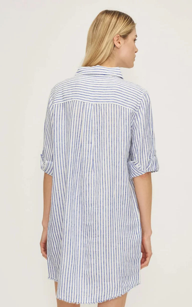 Elevate your warm-weather wardrobe with the Melissa Nepton- Cynthia Striped Shirt Dress, a stylish and airy option for any occasion. Constructed from lightweight linen and adorned with classic vertical stripes, this dress boasts a button-down front, convenient chest pockets, and versatile roll-tab sleeves. A frayed hem adds a hint of casual flair, making it a versatile piece that can be dressed up or down. Pair it with sandals for a relaxed daytime look, or throw it over your swimsuit for a simple beach cover-up.