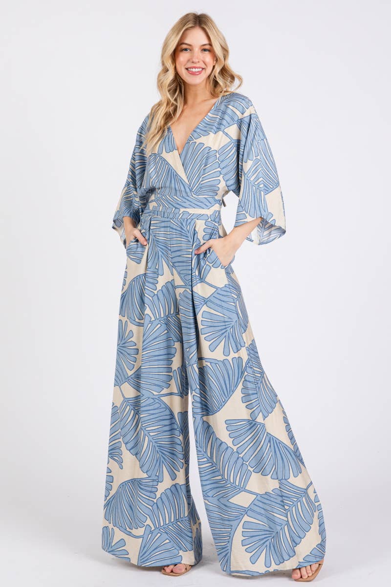 Women Woven Palm Print 3/4 Sleeve V- Neck Jumpsuit with Pocket 83% Rayon, 17% Nylon 2:2:2 Ratio