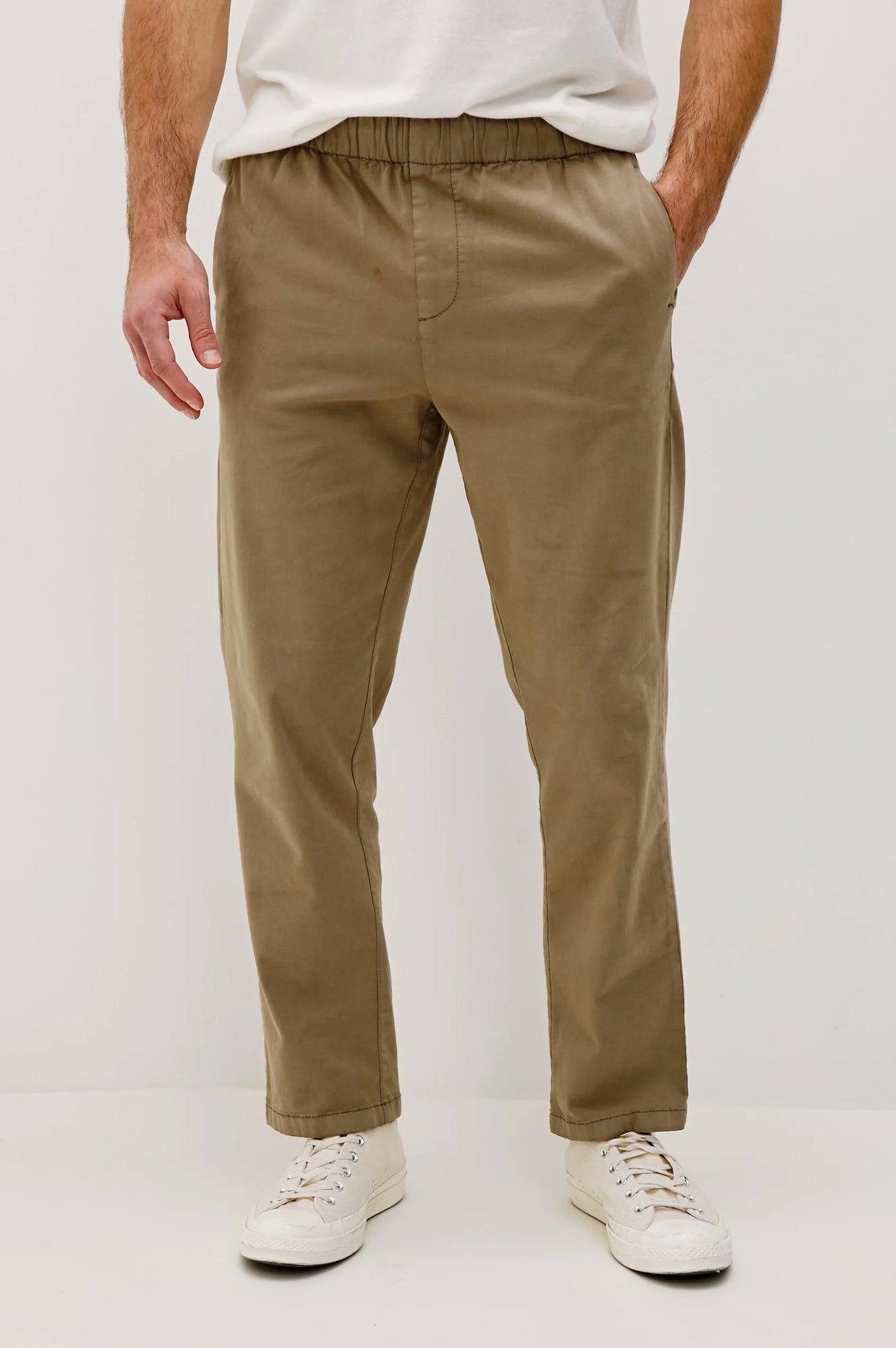 Half way between relaxed and slim fit to allow you to stay comfortable for easy movement yet still look refined. Roll and cuff for a cool and casual styled look. Made from a soft lightweight cotton trouser this pant features an elastic waist and welt back pockets. Garment dyed for a worn, vintage look.