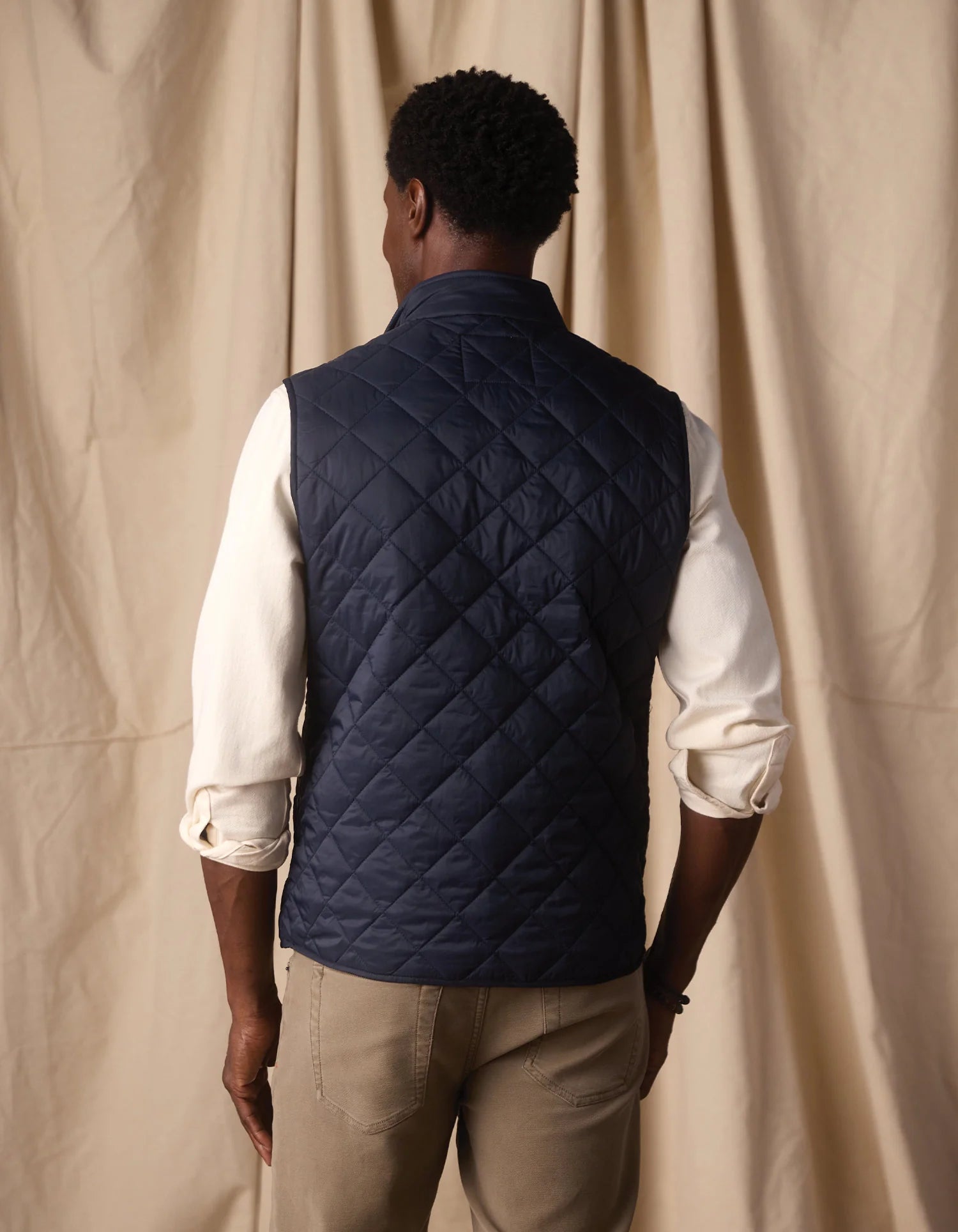 Perfect for a casual office look. The Quilted Liner Vest is a lightweight layer designed for versatility. Made with a slick puffer shell and insulated quilting for warmth. Details like the stand collar with contrast suede fabric, piping at the pockets, and a full 2-way zip make it feel polished while keeping things functional. A go-to for transitional weather or layering up on colder days.